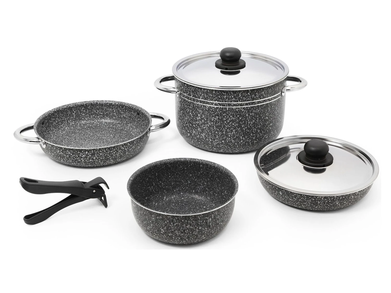 De Beaver kookset Stone Rock 20 is een 4-delige set. Deze pannen zijn gemaakt van 99,5% aluminium en voorzien van een antiaanbaklaag.