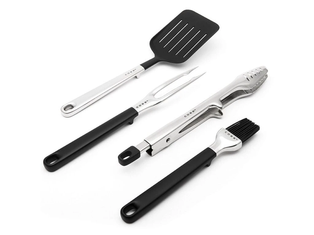 De set bestaat uit een spatel, vork, tang en een kwast. De set wordt geleverd in een handige, afsluitbare opbergtas. Alle gereedschappen zijn voorzien van een voetje, zodat ze net iets van de ondergrond liggen.