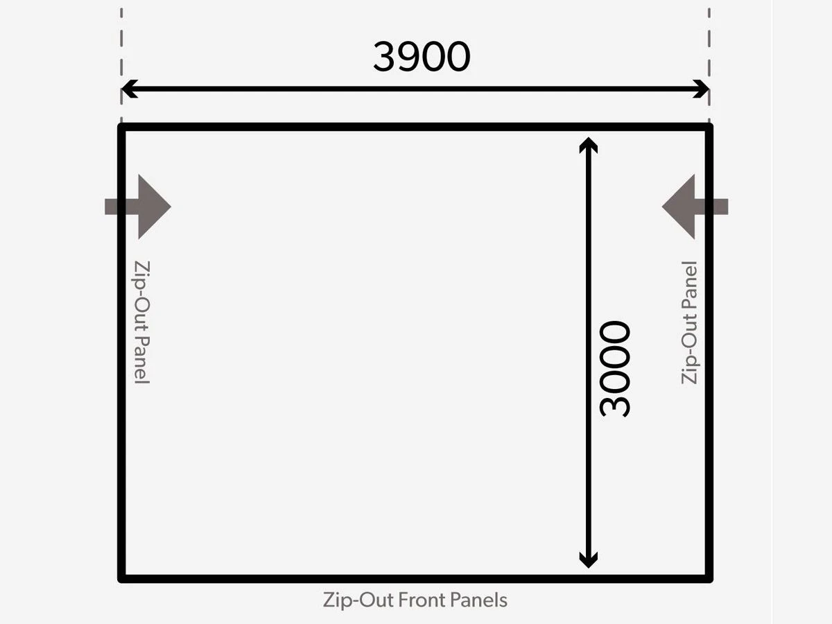 De voortent is 390 cm breed. Dit betekent dat je bij een caravan een rechte rail van minstens 390 cm nodig hebt om de voortent op te kunnen zetten. Wil je de voortent in de rail van je luifel schuiven? Dan moet de luifel minstens 400 cm lang zijn.