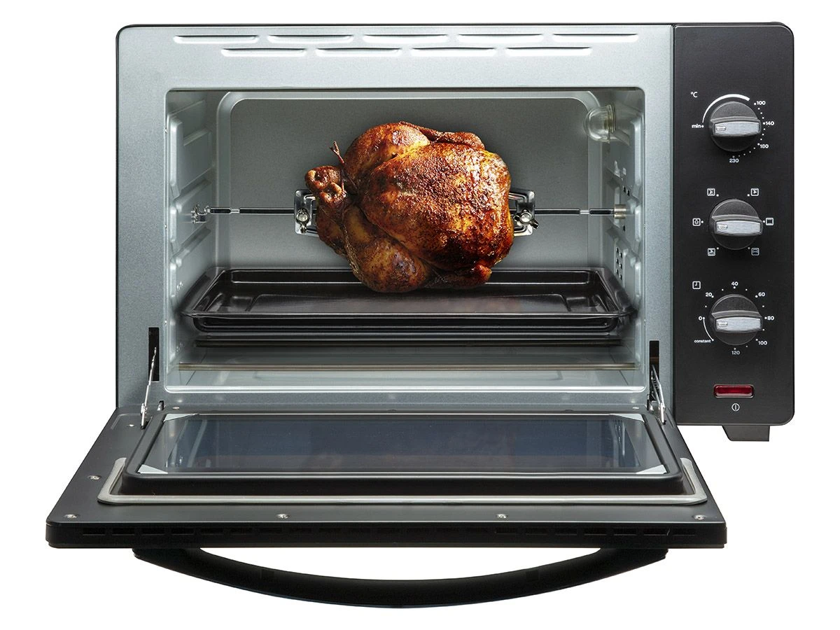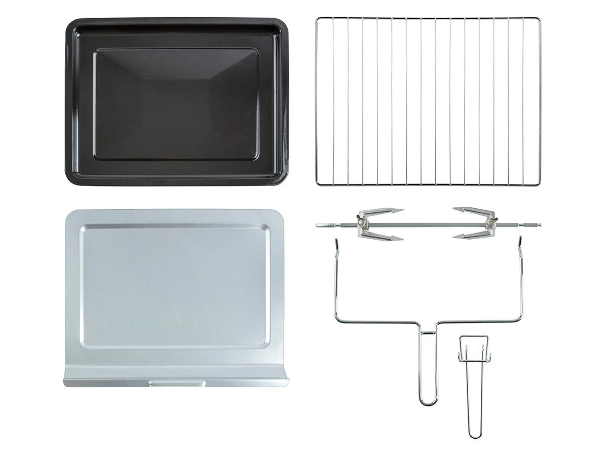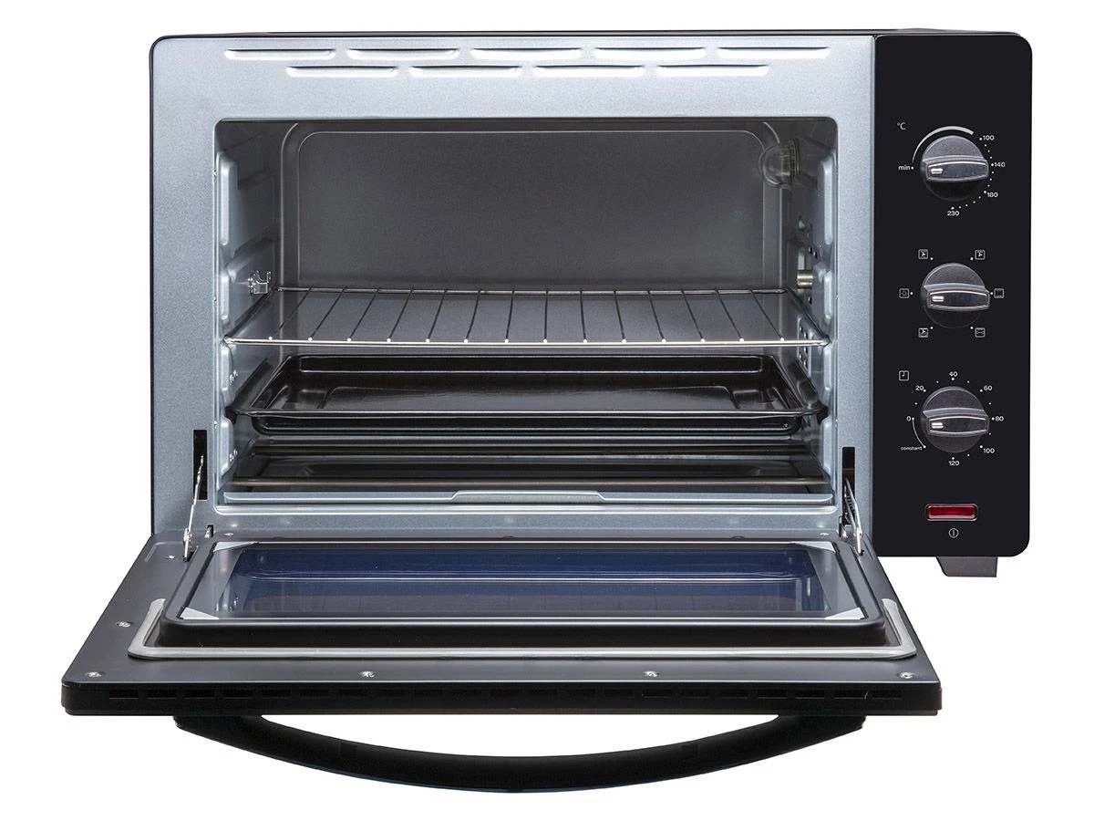 De oven heeft een inhoud van 45 liter, heeft een regelbare temperatuur tot 230°C en is voorzien van een timer die in kunt instellen tot 120 minuten. Door de non-sticklaag aan de binnenzijde, is de oven makkelijk schoon te maken. De oven wordt geleverd met een bakplaat, ovenrooster en een kruimelplaat.