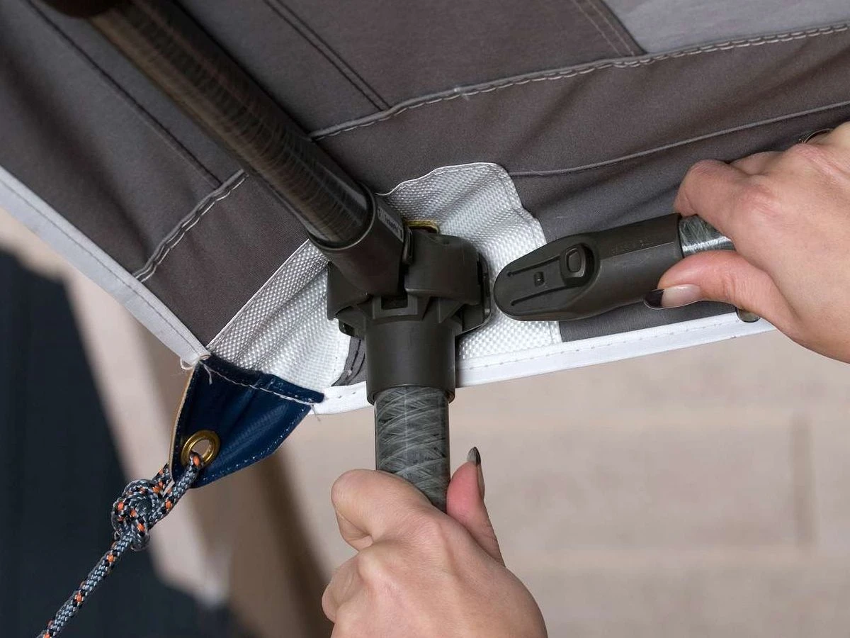 Het luifelframe voor de Eclipse luifel is optioneel verkrijbaar. Je kunt kiezen uit een lichtgewicht CarbonX frame of het stevige stalen MegaFrame. De frames worden geleverd met de Isabella F-links om het luifelframe aan het voortentframe te koppelen.