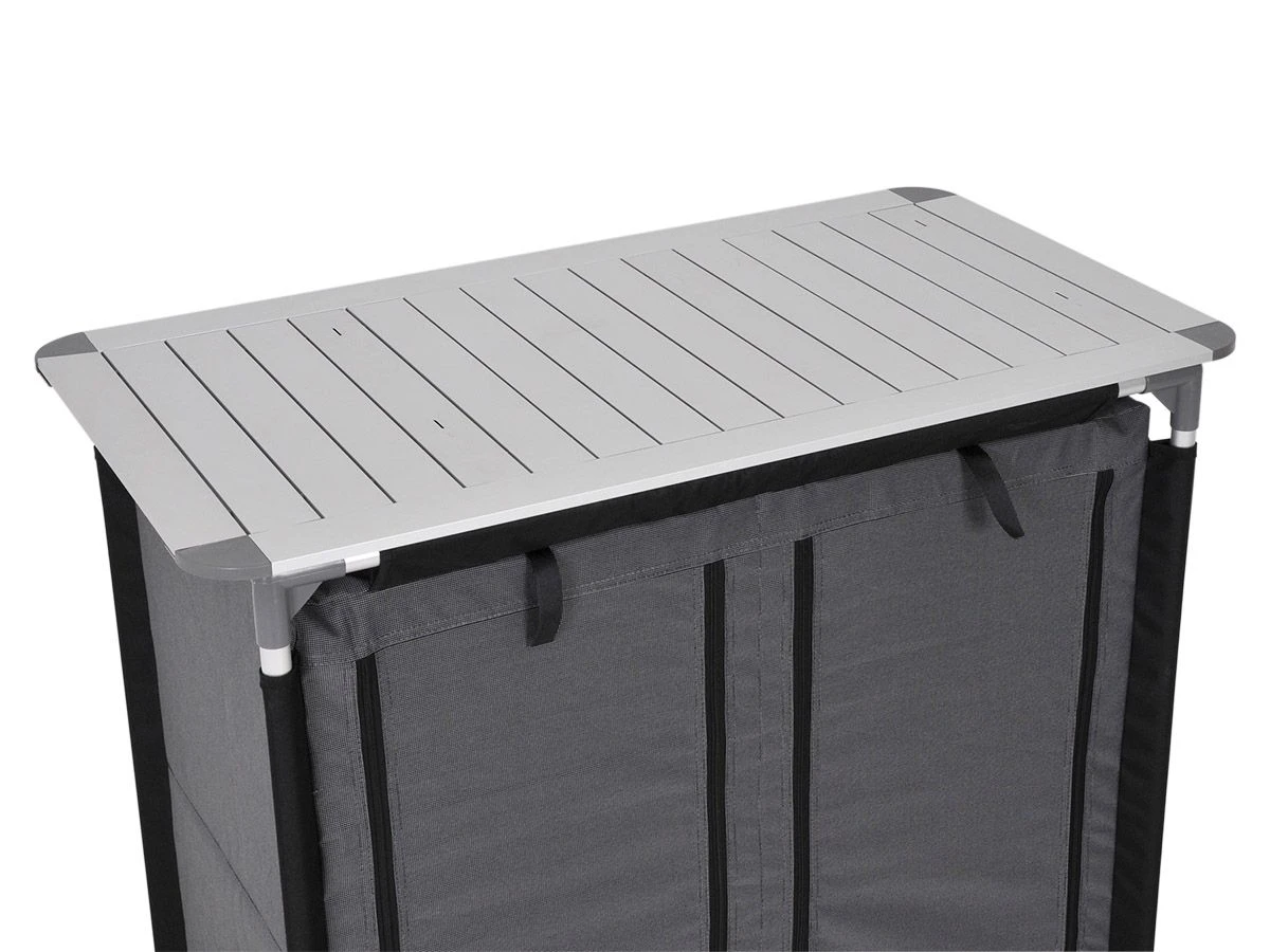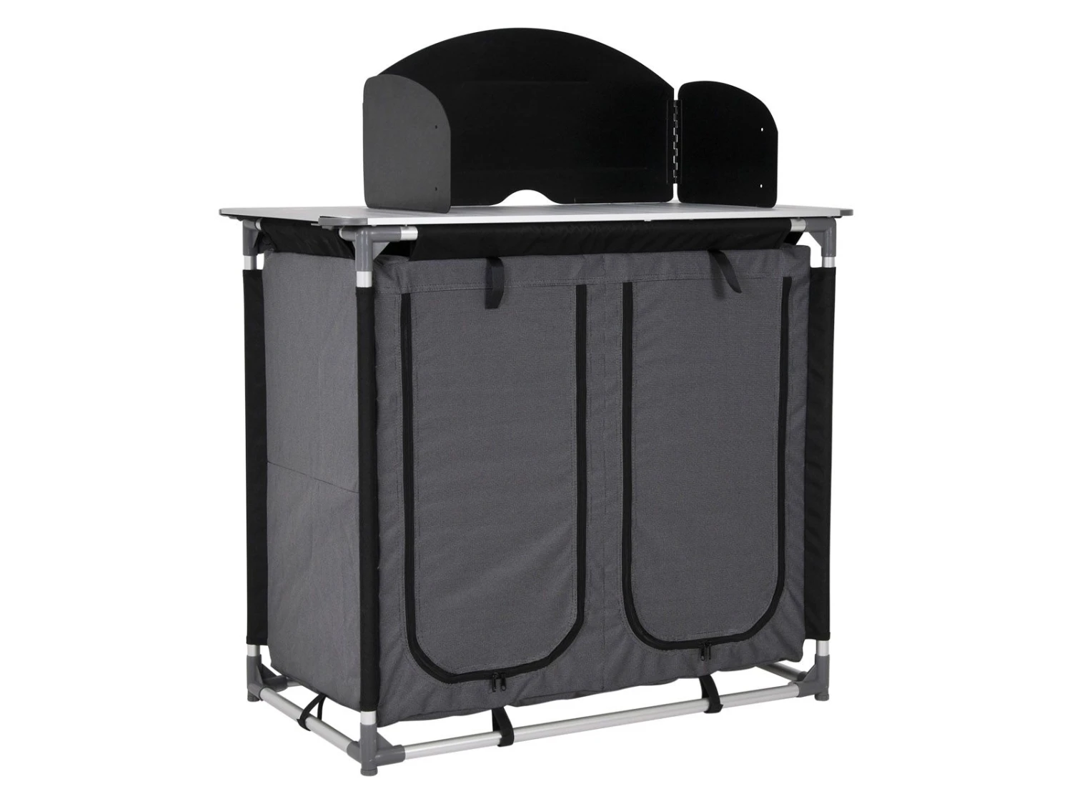 De Florence is voorzien van een windscherm die ervoor zorgt dat je kooktoestel niet uitwaait door te veel wind. Het windscherm is te gebruiken bij een kooktoestel met een maximale afmeting van 60 x 40 cm. Het windscherm kan ook verwijderd worden van het bovenblad zodat je de campingkeuken ook als gewone campingkast kunt gebruiken. Deze campingkeuken kan opgeborgen worden in de meegeleverde draagtas