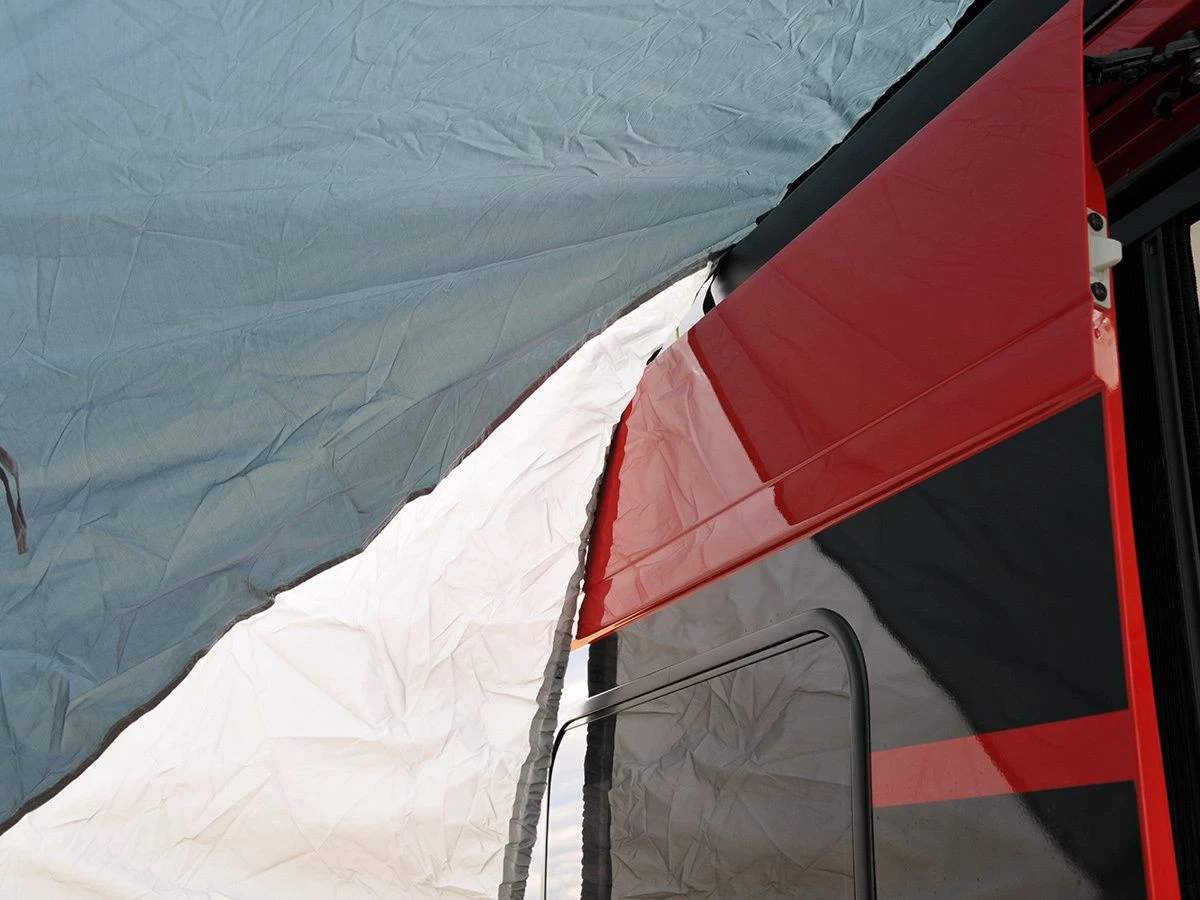 De Mallorca Easy Air Tall is eenvoudig aan de buscamper te koppelen. Je kunt de extra lange aansluitflap met scheerlijnen over het dak van de bus heen trekken en vastzetten met haringen aan de achterzijde. Verder is de aanlsuitflap voorzien van een 5 en 7 mm pees voor bevestiging aan een tentrail, cassetteluifel, pees- of magneetadapter.