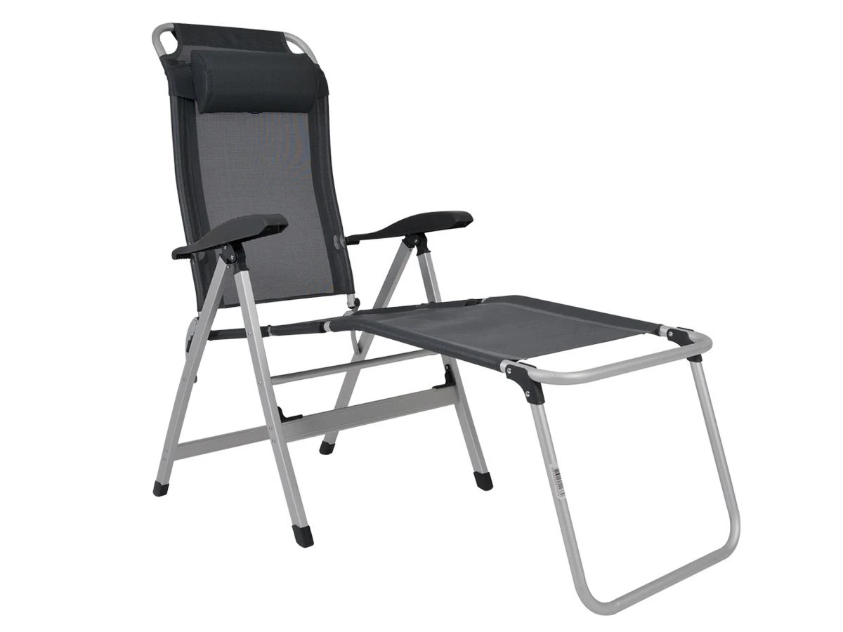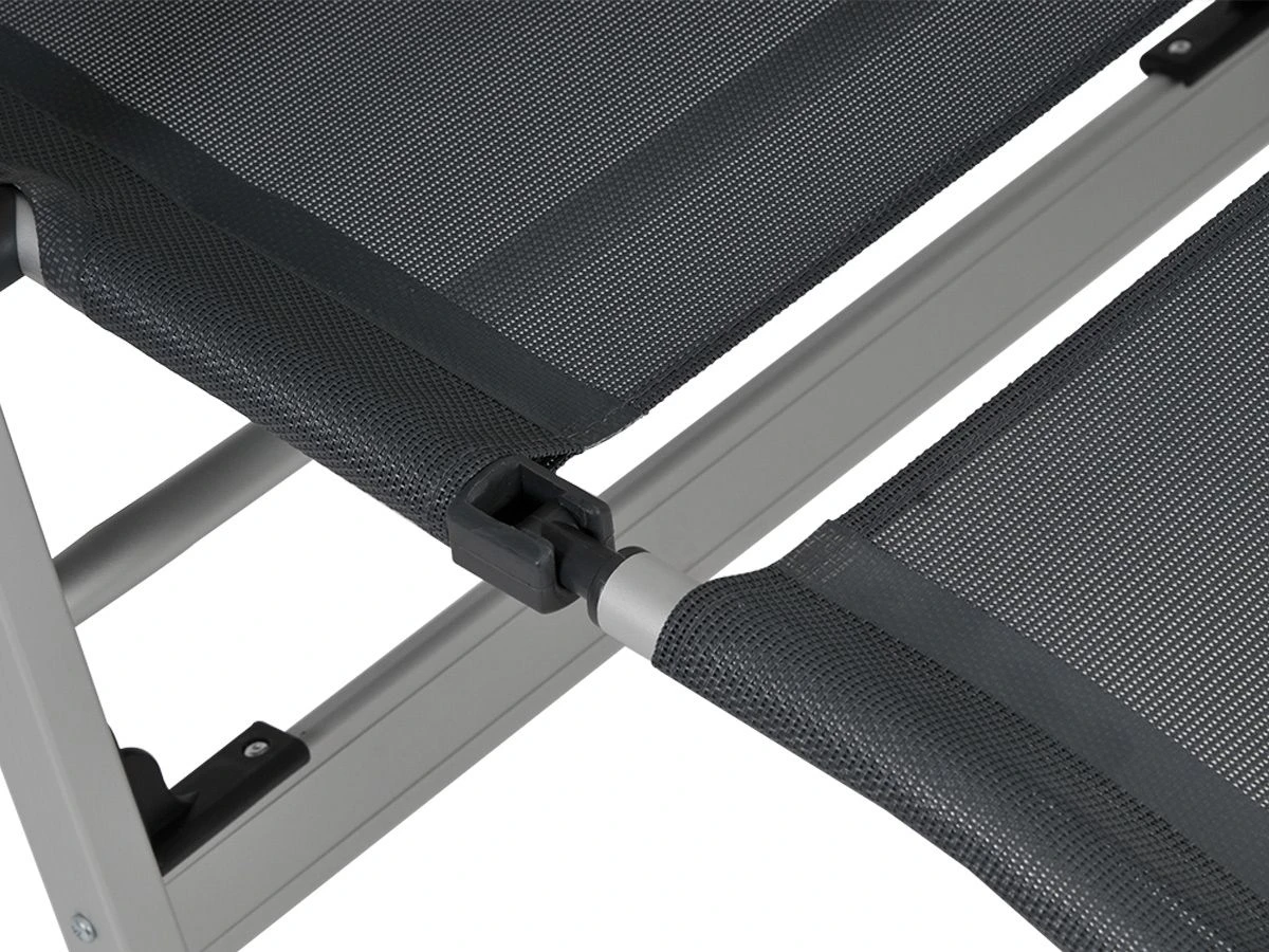 Het frame is gemaakt van aluminium en met daarop een textileen bekleding. De voetensteun is na gebruik plat in te klappen zodat hij eenvoudig vervoerd en bewaard kan worden.