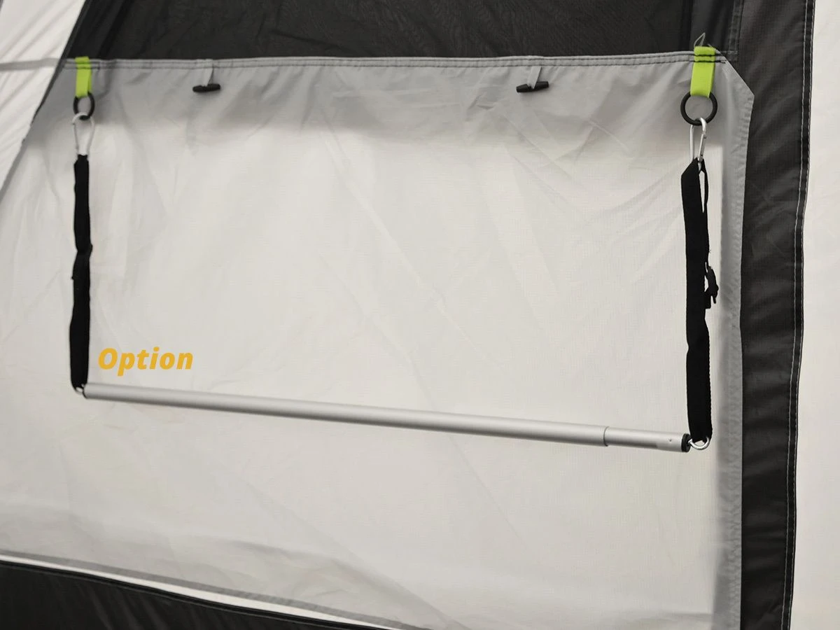De voorwand van de Viera 390 bestaat uit drie panelen. Het linker paneel is volledig omhoog te ritsen en kan bovendien ook uitgezet worden als luifeltje met de meegeleverde luifelstaanders, scheerlijnen en haringen. De grote ramen in de voor- en zijwand zijn van binnenuit af te dekken met een dichte afdekflap wanneer extra privacy gewenst is. Voor extra ventilatie is de bovenste helft van beide zijramen voorzien van horrengaas. Het horrengaas is van buitenaf te bedekken met een afdekflap. Beide zijdeuren zijn naast de dichte deur ook voorzien van een gaasdeur. Zo kun je op een warme zomerdag alles open gooien zonder dat er insecten binnen komen. Voor een mooie aansluiting tegen de caravan zijn de zijwanden voorzien van een dikke schuimrand om tocht en wind buiten te houden. Aan de onderzijde van het tentdoek zitten slikranden die onder het meegeleverde grondzeil gevouwen kunnen worden om regenwater en ongedierte zoveel mogelijk buiten de tent te houden.