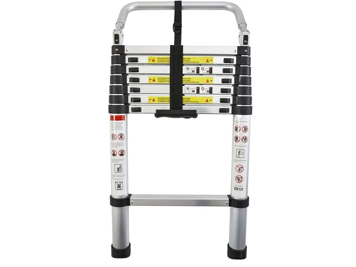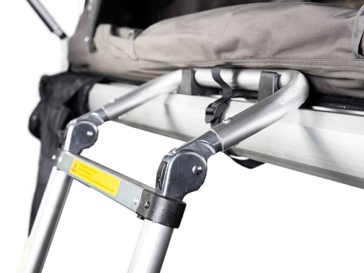 Deze ladder is in hoogte verstelbaar tot een hoogte van 230 cm. Met de beugel aan de bovenzijde klik je deze eenvoudig in de houders van de daktent.